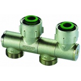 Универсальный узел нижнего подключения радиаторов. Применяется в случае когда ввод теплоносителя может производится с разных направлений, подача со стены, обратка в пол, или в случае когда нет соосности вводящих трубопроводов. Позволяет отсекать стальные радиаторы от трубопроводов.